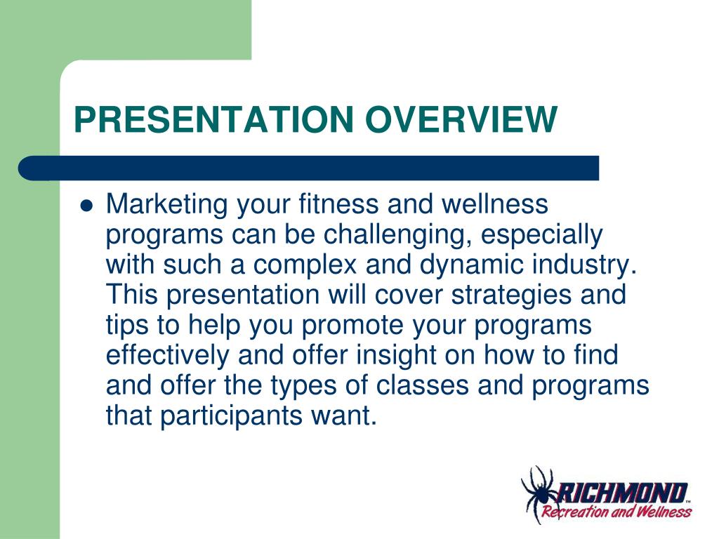 PRESENTATION OVERVIEW • Marketing your fitness and wellness programs can be challenging, especially with such a complex and dynamic industry. This presentation will cover strategies and tips to help you promote your programs effectively and offer insight on how to find and offer the types of classes and programs that participants want.