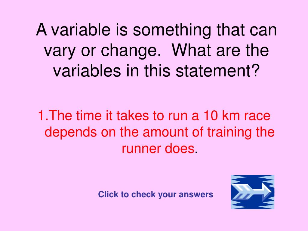A variable is something that can vary or change. What are the variables in this statement? 1.The time it takes to run a 10 km race depends on the amount of training the runner does. Click to check your answers