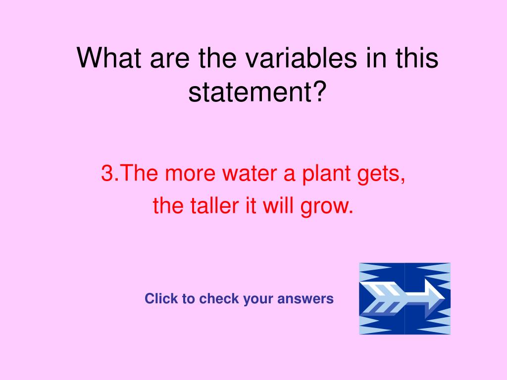 What are the variables in this statement? 3.The more water a plant gets, the taller it will grow. Click to check your answers