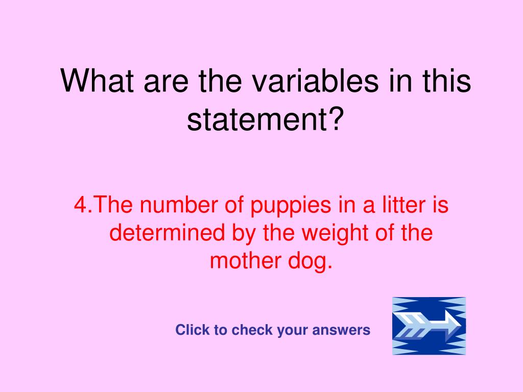 What are the variables in this statement? 4.The number of puppies in a litter is determined by the weight of the mother dog. Click to check your answers