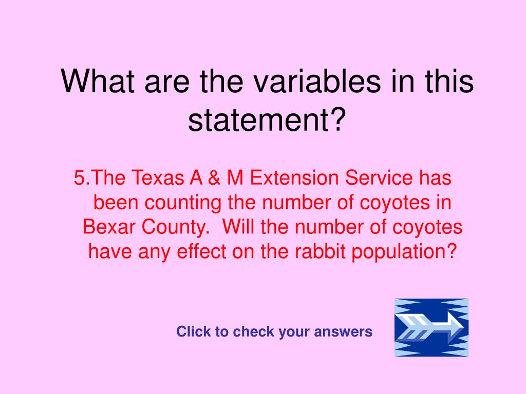 What are the variables in this statement? 5.The Texas A & M Extension Service has been counting the number of coyotes in Bexar County. Will the number of coyotes have any effect on the rabbit population? Click to check your answers