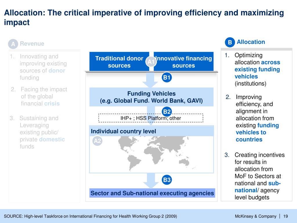 B • B2 • B3 • B1 • A • Innovating and improving existing sources of donor funding • 2. Facing the impact of the global financial crisis • 3. Sustaining and Leveraging existing public/ private domestic funds • A2 Allocation: The critical imperative of improving efficiency and maximizing impact • Allocation • Revenue • Optimizing allocation across existing funding vehicles (institutions) • Traditional donor sources • Innovative financing sources • A1 • Funding Vehicles (e.g. Global Fund, World Bank, GAVI) • Improving efficiency, and alignment in allocation from existing funding vehicles to countries IHP+ ; HSS Platform; other • Individual country level • Creating incentives for results in allocation from MoF to Sectors at national and sub-national/ agency level budgets • Sector and Sub-national executing agencies SOURCE: High-level Taskforce on International Financing for Health Working Group 2 (2009)