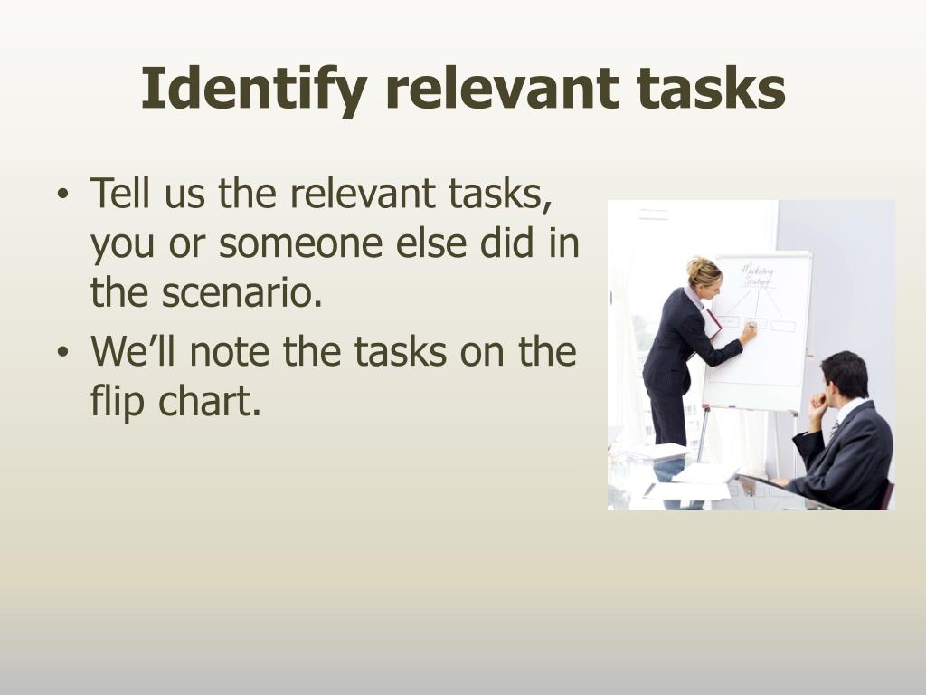 Identify relevant tasks • Tell us the relevant tasks, you or someone else did in the scenario. • We’ll note the tasks on the flip chart.