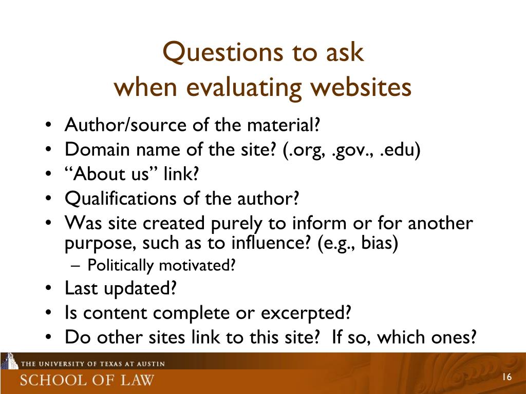 Questions to ask when evaluating websites • Author/source of the material? • Domain name of the site? (.org, .gov., .edu) • “About us” link? • Qualifications of the author? • Was site created purely to inform or for another purpose, such as to influence? (e.g., bias) • Politically motivated? • Last updated? • Is content complete or excerpted? • Do other sites link to this site? If so, which ones?