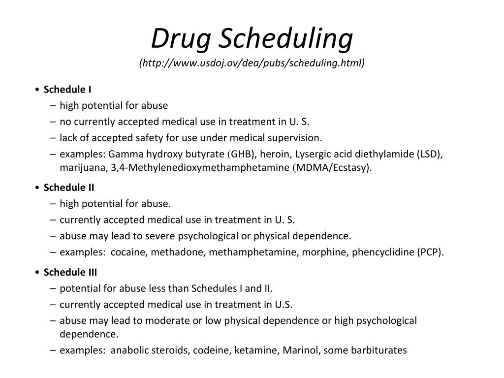 Drug Scheduling(http://www.usdoj.ov/dea/pubs/scheduling.html) • Schedule I • high potential for abuse • no currently accepted medical use in treatment in U. S. • lack of accepted safety for use under medical supervision. • examples:Gamma hydroxy butyrate (GHB), heroin, Lysergic acid diethylamide (LSD), marijuana, 3,4-Methylenedioxymethamphetamine (MDMA/Ecstasy). • Schedule II • high potential for abuse. • currently accepted medical use in treatment in U. S. • abuse may lead to severe psychological or physical dependence. • examples: cocaine, methadone, methamphetamine, morphine, phencyclidine (PCP). • Schedule III • potential for abuse less than Schedules I and II. • currently accepted medical use in treatment in U.S. • abuse may lead to moderate or low physical dependence or high psychological dependence. • examples: anabolic steroids, codeine, ketamine, Marinol, some barbiturates