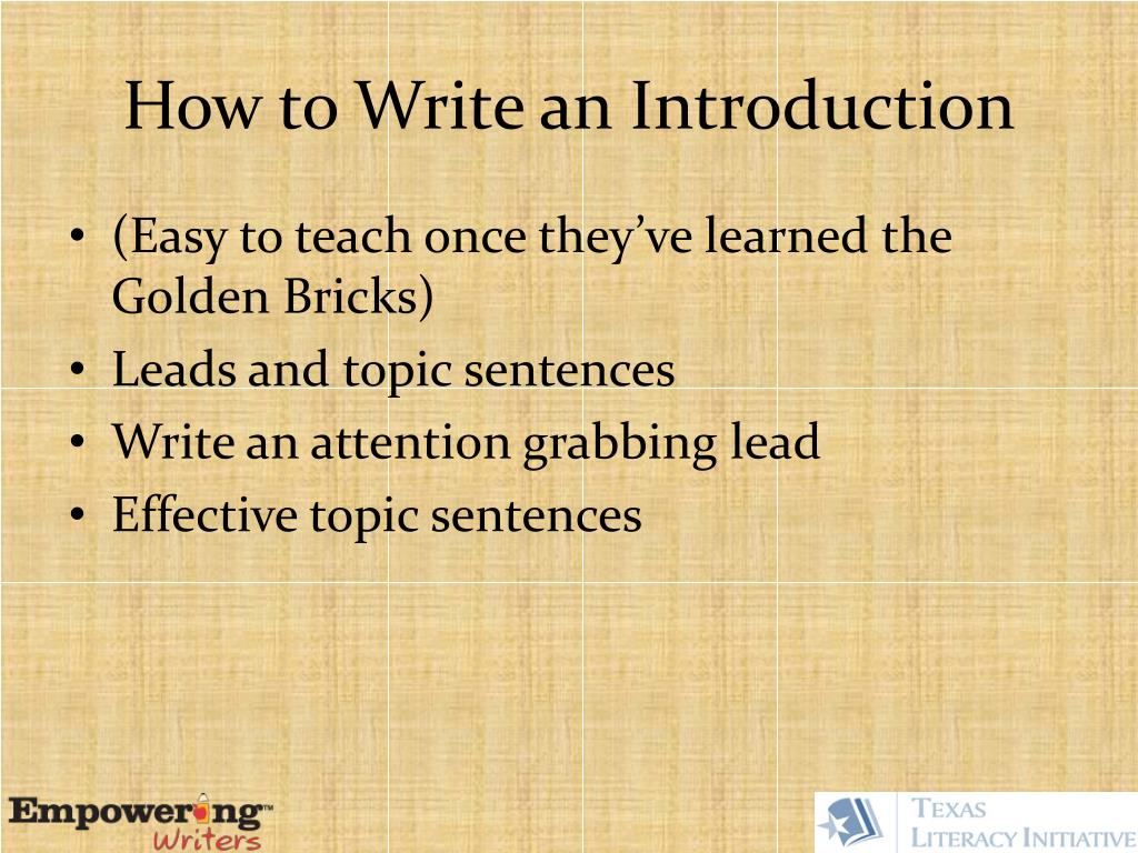 How to Write an Introduction • (Easy to teach once they’ve learned the Golden Bricks) • Leads and topic sentences • Write an attention grabbing lead • Effective topic sentences