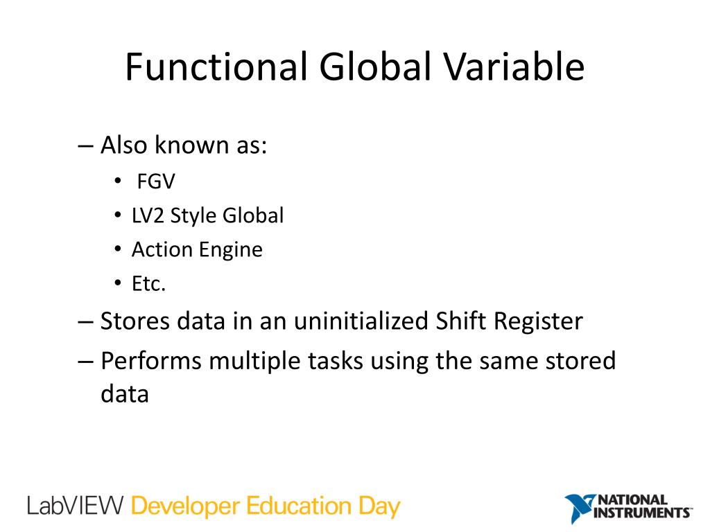 Functional Global Variable • Also known as: • FGV • LV2 Style Global • Action Engine • Etc. • Stores data in an uninitialized Shift Register • Performs multiple tasks using the same stored data
