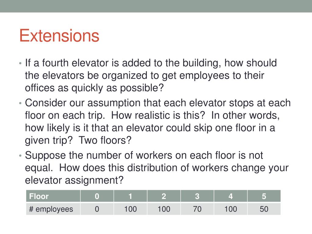 Extensions • If a fourth elevator is added to the building, how should the elevators be organized to get employees to their offices as quickly as possible? • Consider our assumption that each elevator stops at each floor on each trip. How realistic is this? In other words, how likely is it that an elevator could skip one floor in a given trip? Two floors? • Suppose the number of workers on each floor is not equal. How does this distribution of workers change your elevator assignment?