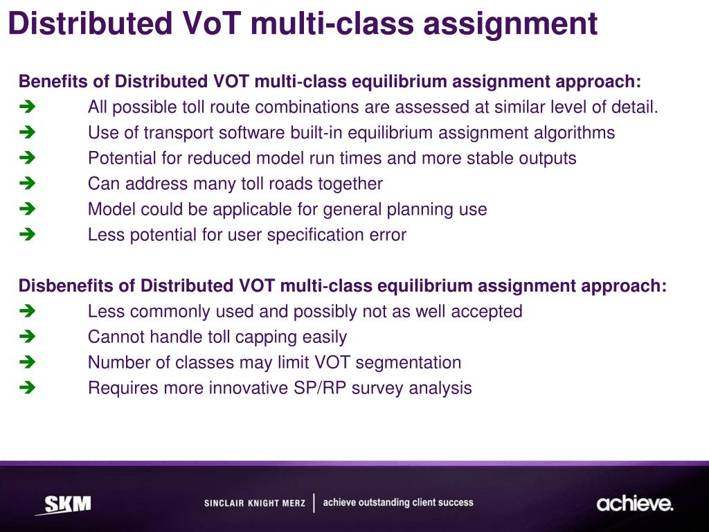Benefits of Distributed VOT multi‐class equilibrium assignment approach: All possible toll route combinations are assessed at similar level of detail. Use of transport software built‐in equilibrium assignment algorithms Potential for reduced model run times and more stable outputs Can address many toll roads together Model could be applicable for general planning use Less potential for user specification error Disbenefits of Distributed VOT multi‐class equilibrium assignment approach: Less commonly used and possibly not as well accepted Cannot handle toll capping easily Number of classes may limit VOT segmentation Requires more innovative SP/RP survey analysis Distributed VoT multi-class assignment