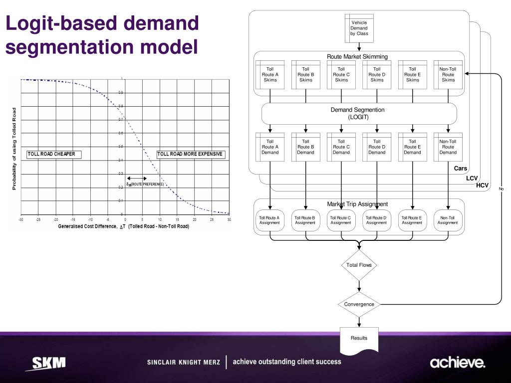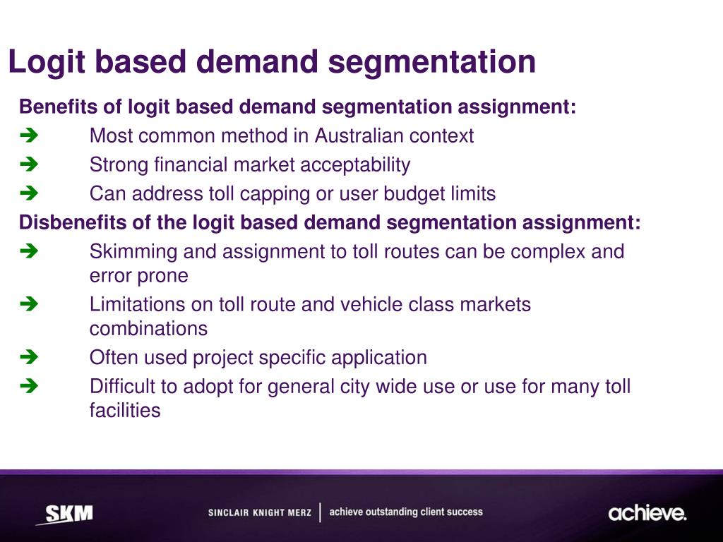 Benefits of logit based demand segmentation assignment: Most common method in Australian context Strong financial market acceptability Can address toll capping or user budget limits Disbenefitsof the logit based demand segmentation assignment: Skimming and assignment to toll routes can be complex and error prone Limitations on toll route and vehicle class markets combinations Often used project specific application Difficult to adopt for general city wide use or use for many toll facilities Logitbased demand segmentation