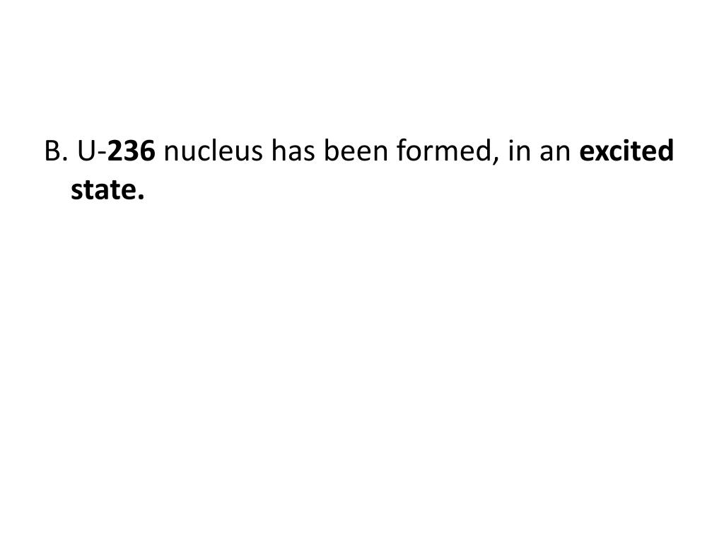 7. Fission. Sequence of events – using the reaction with U-235: A. The neutron approaches the nucleus of U-23 5. B. U- 236 nucleus has been formed, in an excited state. .