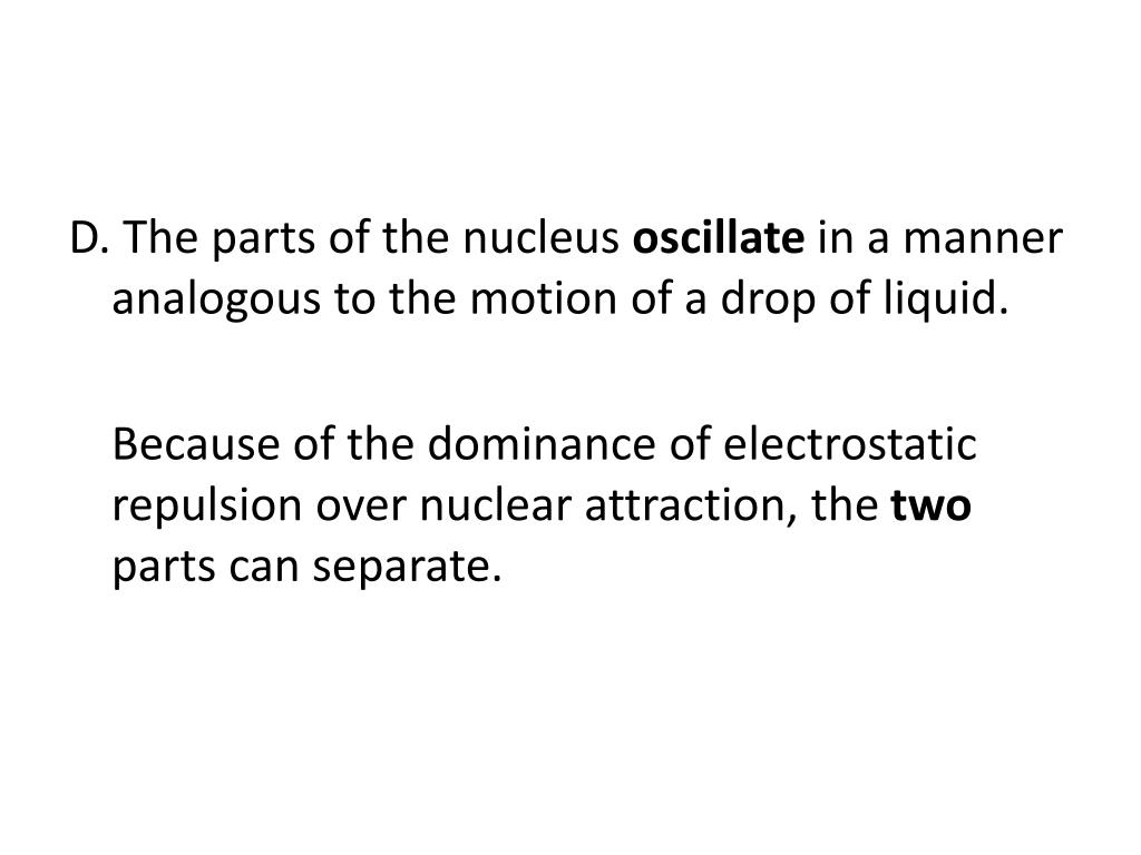 D. The parts of the nucleus oscillate in a manner analogous to the motion of a drop of liquid. Because of the dominance of electrostatic repulsion over nuclear attraction, the two parts can separate.