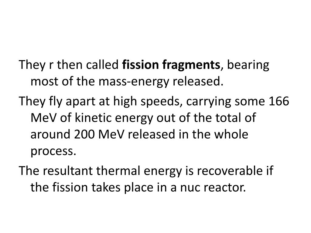 They r then called fission fragments, bearing most of the mass-energy released. They fly apart at high speeds, carrying some 166 MeV of kinetic energy out of the total of around 200 MeV released in the whole process. The resultant thermal energy is recoverable if the fission takes place in a nuc reactor.