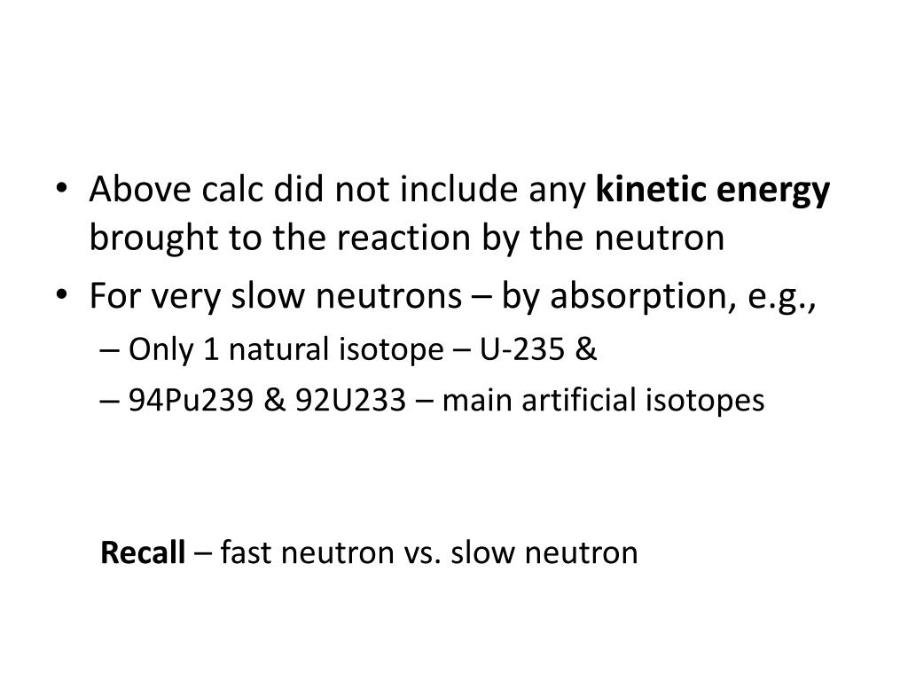 Above calc did not include any kinetic energy brought to the reaction by the neutron • For very slow neutrons – by absorption, e.g., • Only 1 natural isotope – U-235 & • 94Pu239 & 92U233 – main artificial isotopes Recall – fast neutron vs. slow neutron
