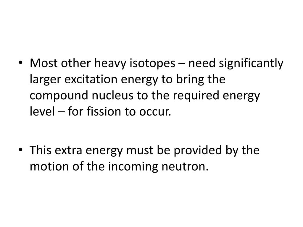 Most other heavy isotopes – need significantly larger excitation energy to bring the compound nucleus to the required energy level – for fission to occur. • This extra energy must be provided by the motion of the incoming neutron.