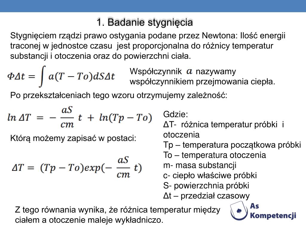 1. Badanie stygnięcia Stygnięciem rządzi prawo ostygania podane przez Newtona: Ilość energii traconej w jednostce czasu jest proporcjonalna do różnicy temperatur substancji i otoczenia oraz do powierzchni ciała. Współczynnik nazywamy współczynnikiem przejmowania ciepła. Po przekształceniach tego wzoru otrzymujemy zależność: Gdzie: ΔT- różnica temperatur próbki i otoczenia Tp – temperatura początkowa próbki To – temperatura otoczenia m- masa substancji c- ciepło właściwe próbki S- powierzchnia próbki Δt – przedział czasowy Którą możemy zapisać w postaci: Z tego równania wynika, że różnica temperatur między ciałem a otoczenie maleje wykładniczo.