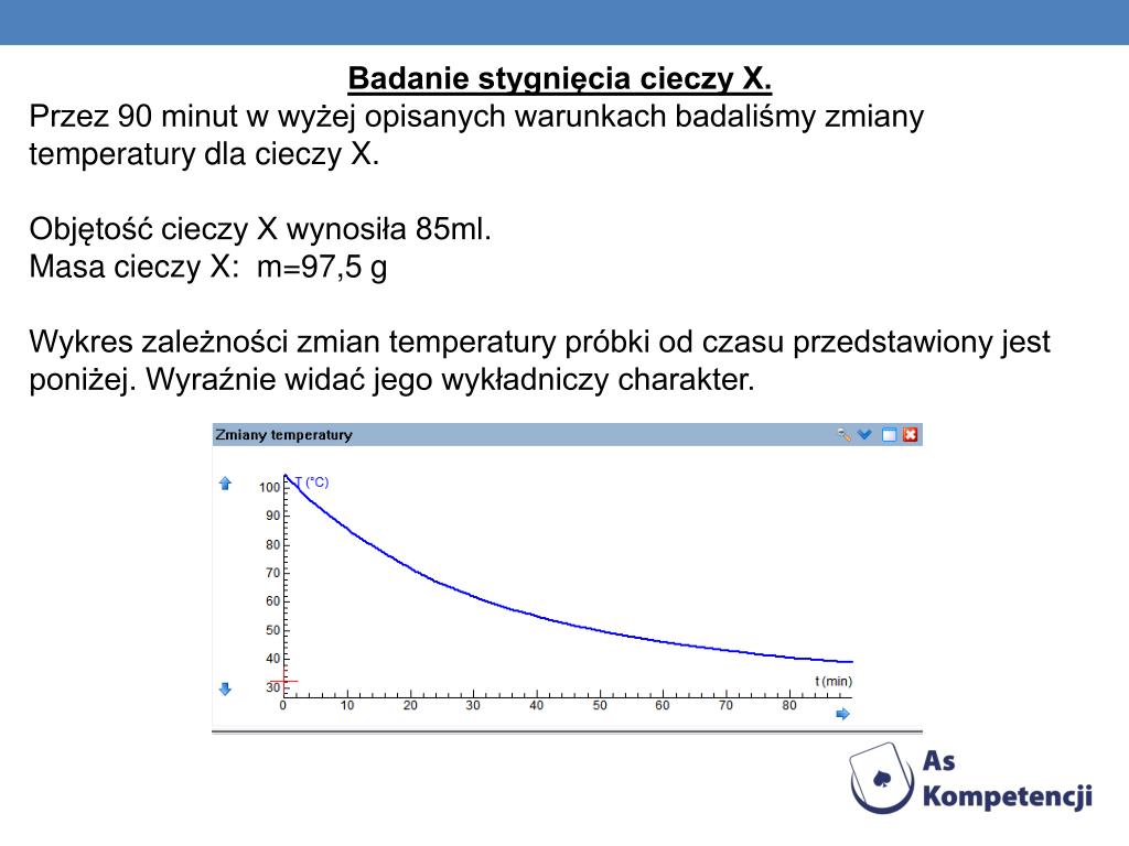 Zarówno woda jak i ciecz X znajdowały się w tej samej zlewce zajmując w niej identyczną objętość. Powierzchnia „stygnięcia” była zatem identyczna. Oba doświadczenia były wykonywane w możliwie najbardziej podobnych warunkach jak na możliwości szkolne. Możemy zatem założyć że jest wartością stałą. Dwa ciała o identycznym kształcie i powierzchni w takich samych warunkach ostygają od temperatury T1 do temperatury T2 w różnych czasach t1 i t2. Przekształcając odpowiednio wzór: Otrzymamy: Odpowiednio podstawiając i porównując równania dla obu cieczy otrzymujemy zależność: