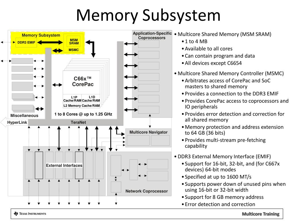 Memory Subsystem • Multicore Shared Memory (MSM SRAM) • 1 to 4 MB • Available to all cores • Can contain program and data • All devices except C6654 • Multicore Shared Memory Controller (MSMC) • Arbitrates access of CorePac and SoCmasters to shared memory • Provides a connection to the DDR3 EMIF • Provides CorePac access to coprocessors and IO peripherals • Provides error detection and correction for all shared memory • Memory protection and address extension to 64 GB (36 bits) • Provides multi-stream pre-fetching capability • DDR3 External Memory Interface (EMIF) • Support for 16-bit, 32-bit, and (for C667x devices) 64-bit modes • Specified at up to 1600 MT/s • Supports power down of unused pins when using 16-bit or 32-bit width • Support for 8 GB memory address • Error detection and correction Application-Specific Memory Subsystem Coprocessors MSM DDR3 EMIF SRAM MSMC C66x™ CorePac L1D L1P Cache/RAM Cache/RAM L2 Memory Cache/RAM 1 to 8 Cores @ up to 1.25 GHz Miscellaneous TeraNet HyperLink Multicore Navigator External Interfaces Network Coprocessor