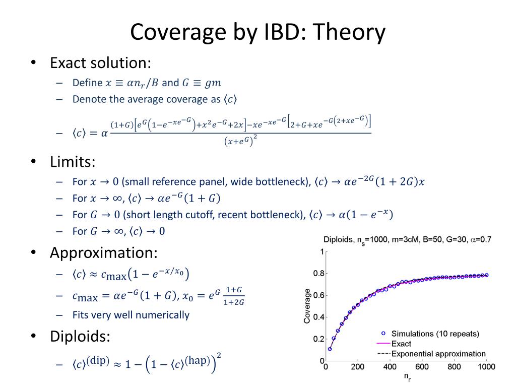 Coverage by IBD: Theory • Exact solution: • Define and • Denote the average coverage as • Limits: • For (small reference panel, wide bottleneck), • For , • For (short length cutoff, recent bottleneck), • For , • Approximation: • , • Fits very well numerically • Diploids: