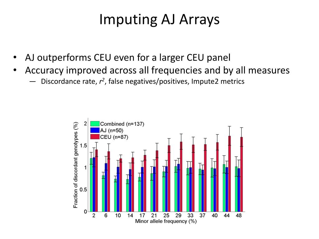 Imputing AJ Arrays • AJ outperforms CEU even for a larger CEU panel • Accuracy improved across all frequencies and by all measures • Discordance rate, r2, false negatives/positives, Impute2 metrics