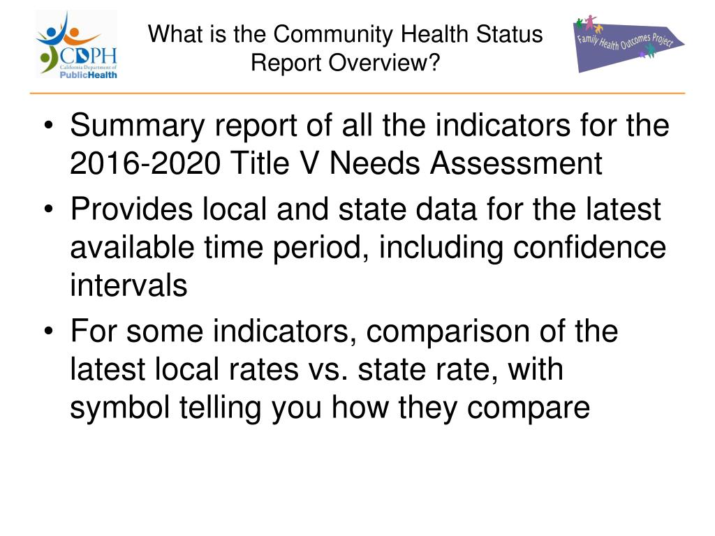 What is the Community Health Status Report Overview? • Summary report of all the indicators for the 2016-2020 Title V Needs Assessment • Provides local and state data for the latest available time period, including confidence intervals • For some indicators, comparison of the latest local rates vs. state rate, with symbol telling you how they compare