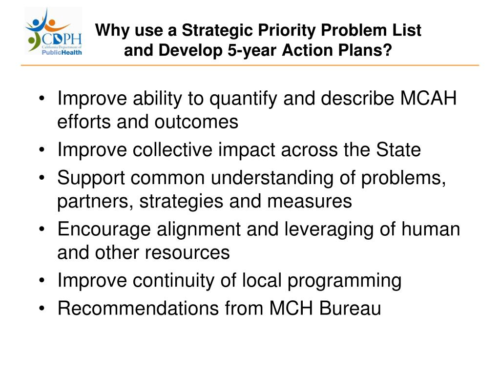 Why use a Strategic Priority Problem List and Develop 5-year Action Plans? • Improve ability to quantify and describe MCAH efforts and outcomes • Improve collective impact across the State • Support common understanding of problems, partners, strategies and measures • Encourage alignment and leveraging of human and other resources • Improve continuity of local programming • Recommendations from MCH Bureau