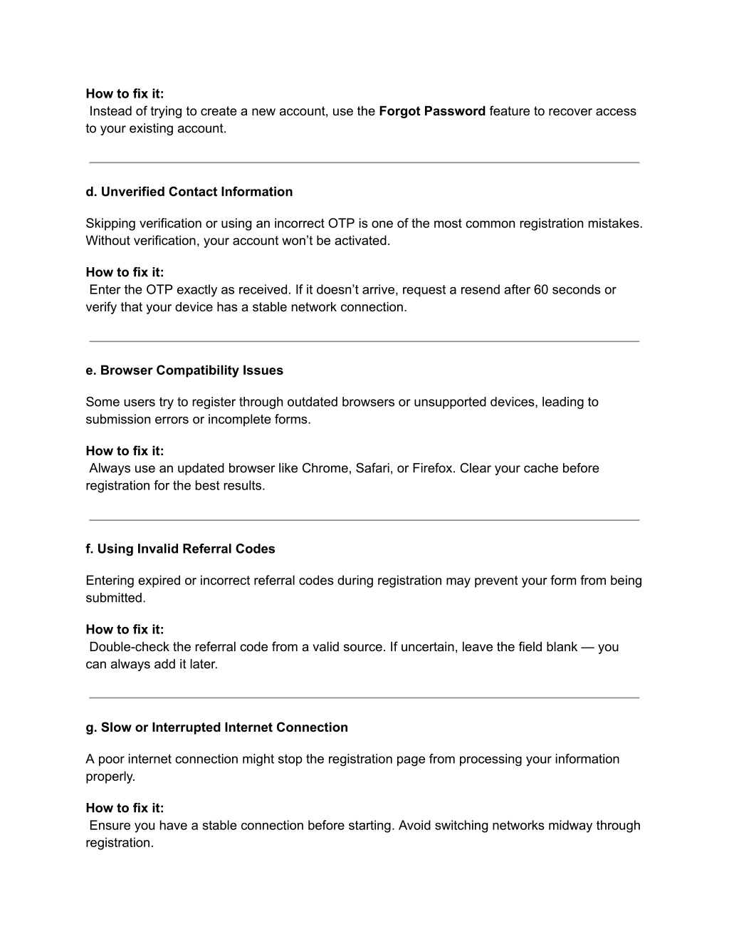 How to fix it: Instead of trying to create a new account, use the Forgot Password feature to recover access to your existing account. d. Unverified Contact Information Skipping verification or using an incorrect OTP is one of the most common registration mistakes. Without verification, your account won’t be activated. How to fix it: Enter the OTP exactly as received. If it doesn’t arrive, request a resend after 60 seconds or verify that your device has a stable network connection. e. Browser Compatibility Issues Some users try to register through outdated browsers or unsupported devices, leading to submission errors or incomplete forms. How to fix it: Always use an updated browser like Chrome, Safari, or Firefox. Clear your cache before registration for the best results. f. Using Invalid Referral Codes Entering expired or incorrect referral codes during registration may prevent your form from being submitted. How to fix it: Double-check the referral code from a valid source. If uncertain, leave the field blank — you can always add it later. g. Slow or Interrupted Internet Connection A poor internet connection might stop the registration page from processing your information properly. How to fix it: Ensure you have a stable connection before starting. Avoid switching networks midway through registration.