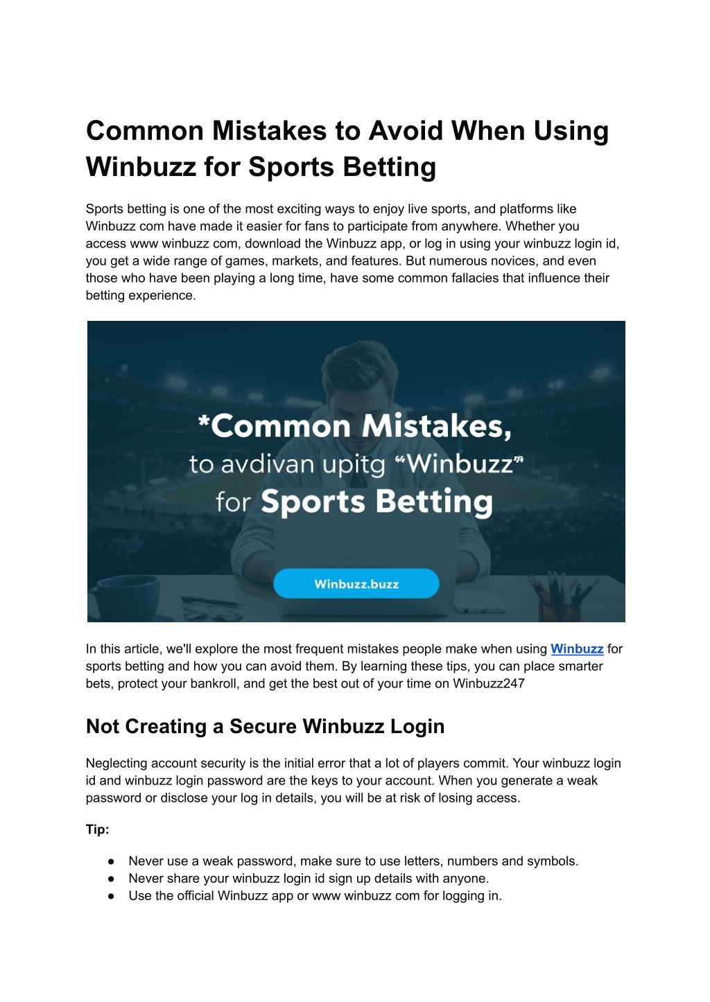 Common Mistakes to Avoid When Using Winbuzz for Sports Betting Sports betting is one of the most exciting ways to enjoy live sports, and platforms like Winbuzz com have made it easier for fans to participate from anywhere. Whether you access www winbuzz com, download the Winbuzz app, or log in using your winbuzz login id, you get a wide range of games, markets, and features. But numerous novices, and even those who have been playing a long time, have some common fallacies that influence their betting experience. In this article, we'll explore the most frequent mistakes people make when using Winbuzz for sports betting and how you can avoid them. By learning these tips, you can place smarter bets, protect your bankroll, and get the best out of your time on Winbuzz247 Not Creating a Secure Winbuzz Login Neglecting account security is the initial error that a lot of players commit. Your winbuzz login id and winbuzz login password are the keys to your account. When you generate a weak password or disclose your log in details, you will be at risk of losing access. Tip: ● Never use a weak password, make sure to use letters, numbers and symbols. ● Never share your winbuzz login id sign up details with anyone. ● Use the official Winbuzz app or www winbuzz com for logging in.