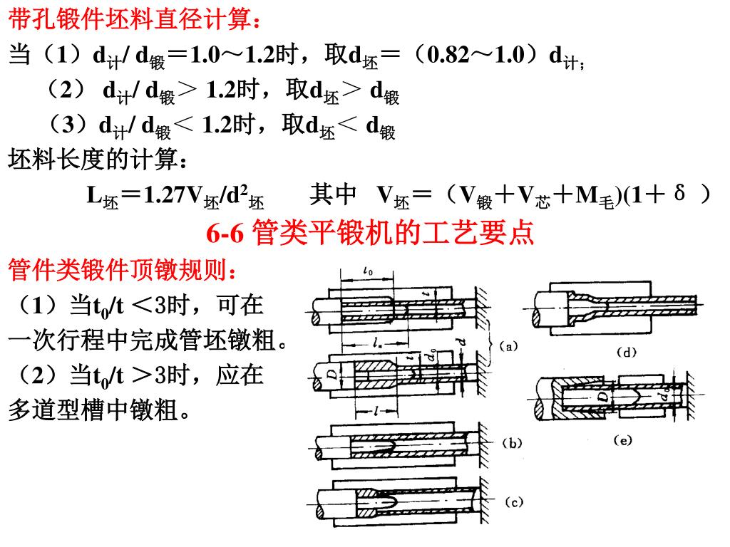 带孔锻件坯料直径计算: 当(1)d计/ d锻=1.0~1.2时,取d坯=(0.82~1.0)d计; (2) d计/ d锻> 1.2时,取d坯>d锻 (3)d计/ d锻< 1.2时,取d坯<d锻 坯料长度的计算: L坯=1.27V坯/d2坯 其中 V坯=(V锻+V芯+M毛)(1+δ) 6-6 管类平锻机的工艺要点 管件类锻件顶镦规则: (1)当t0/t <3时,可在 一次行程中完成管坯镦粗。 (2)当t0/t >3时,应在 多道型槽中镦粗。
