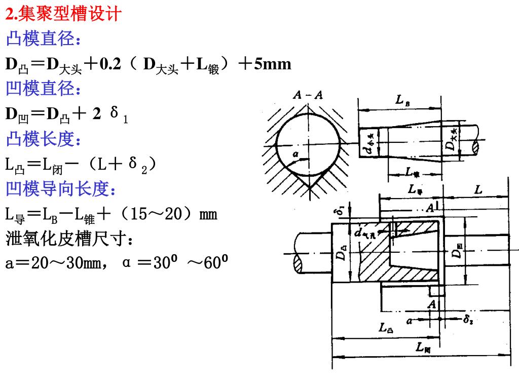 2.集聚型槽设计 凸模直径: D凸=D大头+0.2( D大头+L锻)+5mm 凹模直径: D凹=D凸+ 2 δ1 凸模长度: L凸=L闭-(L+δ2) 凹模导向长度: L导=LB-L锥+(15~20)mm 泄氧化皮槽尺寸: a=20~30mm,α=30⁰ ~60⁰