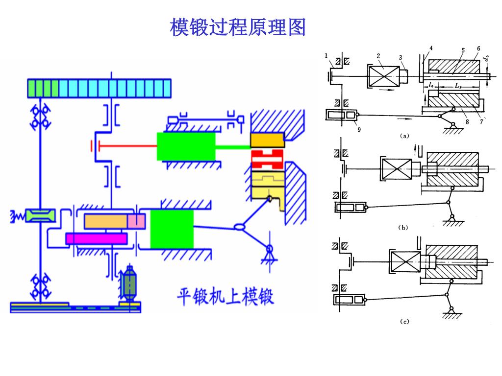 2.平锻机模锻工艺、设备特点及其应用 工艺特点: (1)设有两个相互垂直的分模面,能锻出两个不同方向具有凹档和凹孔的锻件。 (2)坯料水平放料,锻件长度不受设备空间限制,能进行长杆类锻件和长杆空心类锻件的模锻,进行深穿孔或深冲孔工作。