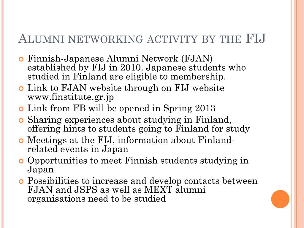 Alumni networking activity by the FIJ • Finnish-Japanese Alumni Network (FJAN) established by FIJ in 2010. Japanese students who studied in Finland are eligible to membership. • Link to FJAN website through on FIJ website www.finstitute.gr.jp • Link from FB will be opened in Spring 2013 • Sharing experiences about studying in Finland, offering hints to students going to Finland for study • Meetings at the FIJ, information about Finland-related events in Japan • Opportunities to meet Finnish students studying in Japan • Possibilities to increase and develop contacts between FJAN and JSPS as well as MEXT alumni organisations need to be studied