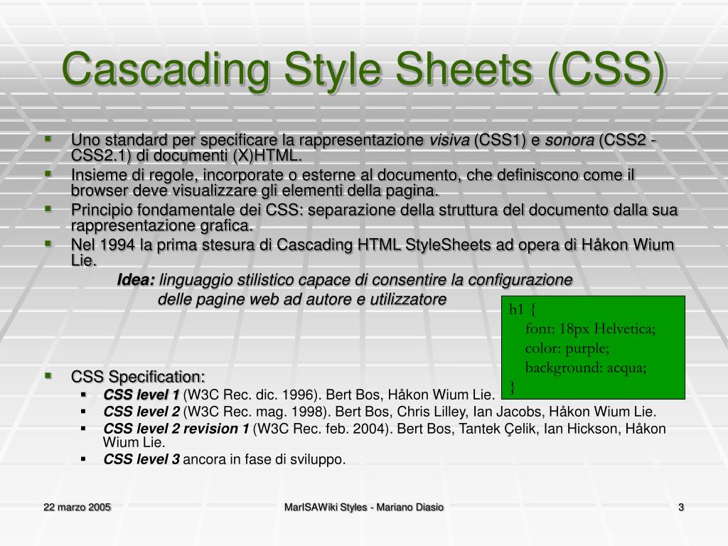 Cascading Style Sheets (CSS) • Uno standard per specificare la rappresentazione visiva (CSS1) e sonora (CSS2 - CSS2.1) di documenti (X)HTML. • Insieme di regole, incorporate o esterne al documento, che definiscono come il browser deve visualizzare gli elementi della pagina. • Principio fondamentale dei CSS: separazione della struttura del documento dalla sua rappresentazione grafica. • Nel 1994 la prima stesura di Cascading HTML StyleSheets ad opera di Håkon Wium Lie. Idea: linguaggio stilistico capace di consentire la configurazione delle pagine web ad autore e utilizzatore • CSS Specification: • CSS level 1(W3C Rec. dic. 1996). Bert Bos, Håkon Wium Lie. • CSS level 2 (W3C Rec. mag. 1998). Bert Bos, Chris Lilley, Ian Jacobs, Håkon Wium Lie. • CSS level 2 revision 1 (W3C Rec. feb. 2004). Bert Bos, Tantek Çelik, Ian Hickson, Håkon Wium Lie. • CSS level 3 ancora in fase di sviluppo. h1 { font: 18px Helvetica; color: purple; background: acqua; } MarISAWiki Styles - Mariano Diasio
