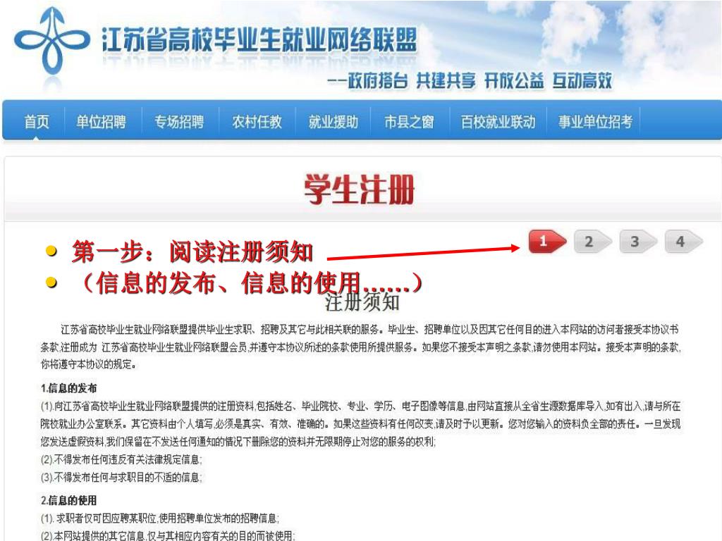 第一步:阅读注册须知 • (信息的发布、信息的使用……)