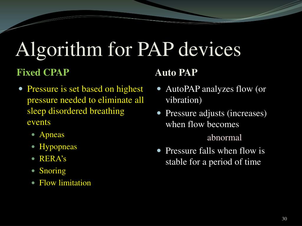 Algorithm for PAP devices Fixed CPAP Auto PAP • Pressure is set based on highest pressure needed to eliminate all sleep disordered breathing events • Apneas • Hypopneas • RERA’s • Snoring • Flow limitation • AutoPAP analyzes flow (or vibration) • Pressure adjusts (increases) when flow becomes abnormal • Pressure falls when flow is stable for a period of time