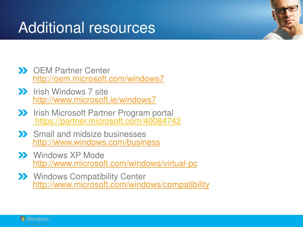 Additional resources • OEM Partner Centerhttp://oem.microsoft.com/windows7 • Irish Windows 7 sitehttp://www.microsoft.ie/windows7 • Irish Microsoft Partner Program portal https://partner.microsoft.com/40084742 • Small and midsize businesseshttp://www.windows.com/business • Windows XP Modehttp://www.microsoft.com/windows/virtual-pc • Windows Compatibility Centerhttp://www.microsoft.com/windows/compatibility
