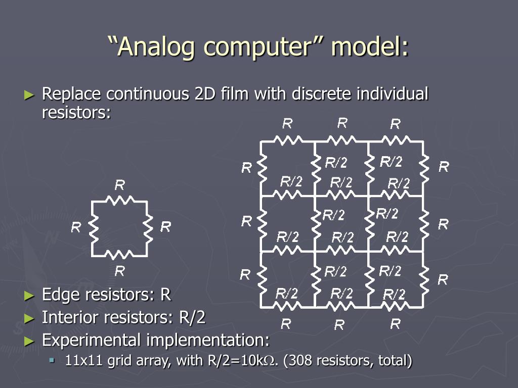“Analog computer” model: • Replace continuous 2D film with discrete individual resistors: • Edge resistors: R • Interior resistors: R/2 • Experimental implementation: • 11x11 grid array, with R/2=10kW. (308 resistors, total)
