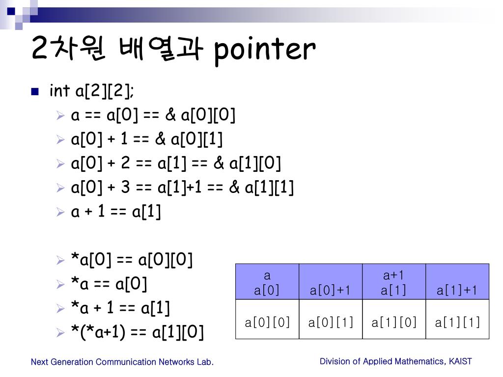 2차원 배열과 pointer • int a[2][2]; • a == a[0] == & a[0][0] • a[0] + 1 == & a[0][1] • a[0] + 2 == a[1] == & a[1][0] • a[0] + 3 == a[1]+1 == & a[1][1] • a + 1 == a[1] • *a[0] == a[0][0] • *a == a[0] • *a + 1 == a[1] • *(*a+1) == a[1][0] a a[0] a[0]+1 a+1 a[1] a[1]+1 a[0][0] a[0][1] a[1][0] a[1][1] Next Generation Communication Networks Lab.
