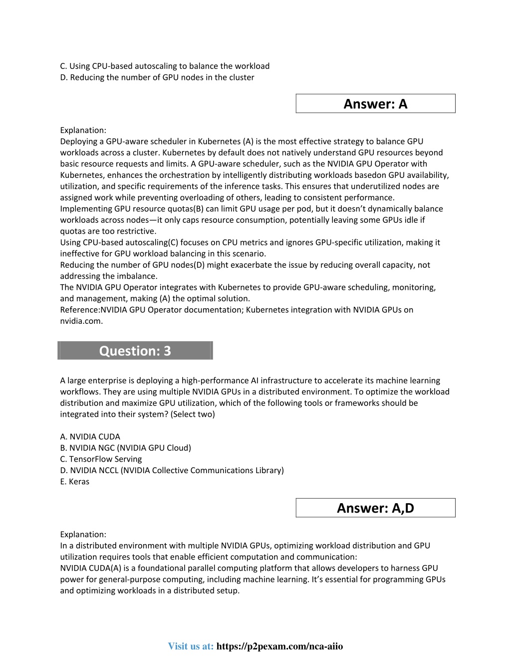 C. Using CPU-based autoscaling to balance the workload D. Reducing the number of GPU nodes in the cluster Answer: A Explanation: Deploying a GPU-aware scheduler in Kubernetes (A) is the most effective strategy to balance GPU workloads across a cluster. Kubernetes by default does not natively understand GPU resources beyond basic resource requests and limits. A GPU-aware scheduler, such as the NVIDIA GPU Operator with Kubernetes, enhances the orchestration by intelligently distributing workloads basedon GPU availability, utilization, and specific requirements of the inference tasks. This ensures that underutilized nodes are assigned work while preventing overloading of others, leading to consistent performance. Implementing GPU resource quotas(B) can limit GPU usage per pod, but it doesn’t dynamically balance workloads across nodes—it only caps resource consumption, potentially leaving some GPUs idle if quotas are too restrictive. Using CPU-based autoscaling(C) focuses on CPU metrics and ignores GPU-specific utilization, making it ineffective for GPU workload balancing in this scenario. Reducing the number of GPU nodes(D) might exacerbate the issue by reducing overall capacity, not addressing the imbalance. The NVIDIA GPU Operator integrates with Kubernetes to provide GPU-aware scheduling, monitoring, and management, making (A) the optimal solution. Reference:NVIDIA GPU Operator documentation; Kubernetes integration with NVIDIA GPUs on nvidia.com. Question: 3 A large enterprise is deploying a high-performance AI infrastructure to accelerate its machine learning workflows. They are using multiple NVIDIA GPUs in a distributed environment. To optimize the workload distribution and maximize GPU utilization, which of the following tools or frameworks should be integrated into their system? (Select two) A. NVIDIA CUDA B. NVIDIA NGC (NVIDIA GPU Cloud) C. TensorFlow Serving D. NVIDIA NCCL (NVIDIA Collective Communications Library) E. Keras Answer: A,D Explanation: In a distributed environment with multiple NVIDIA GPUs, optimizing workload distribution and GPU utilization requires tools that enable efficient computation and communication: NVIDIA CUDA(A) is a foundational parallel computing platform that allows developers to harness GPU power for general-purpose computing, including machine learning. It’s essential for programming GPUs and optimizing workloads in a distributed setup. Visit us at: https://p2pexam.com/nca-aiio