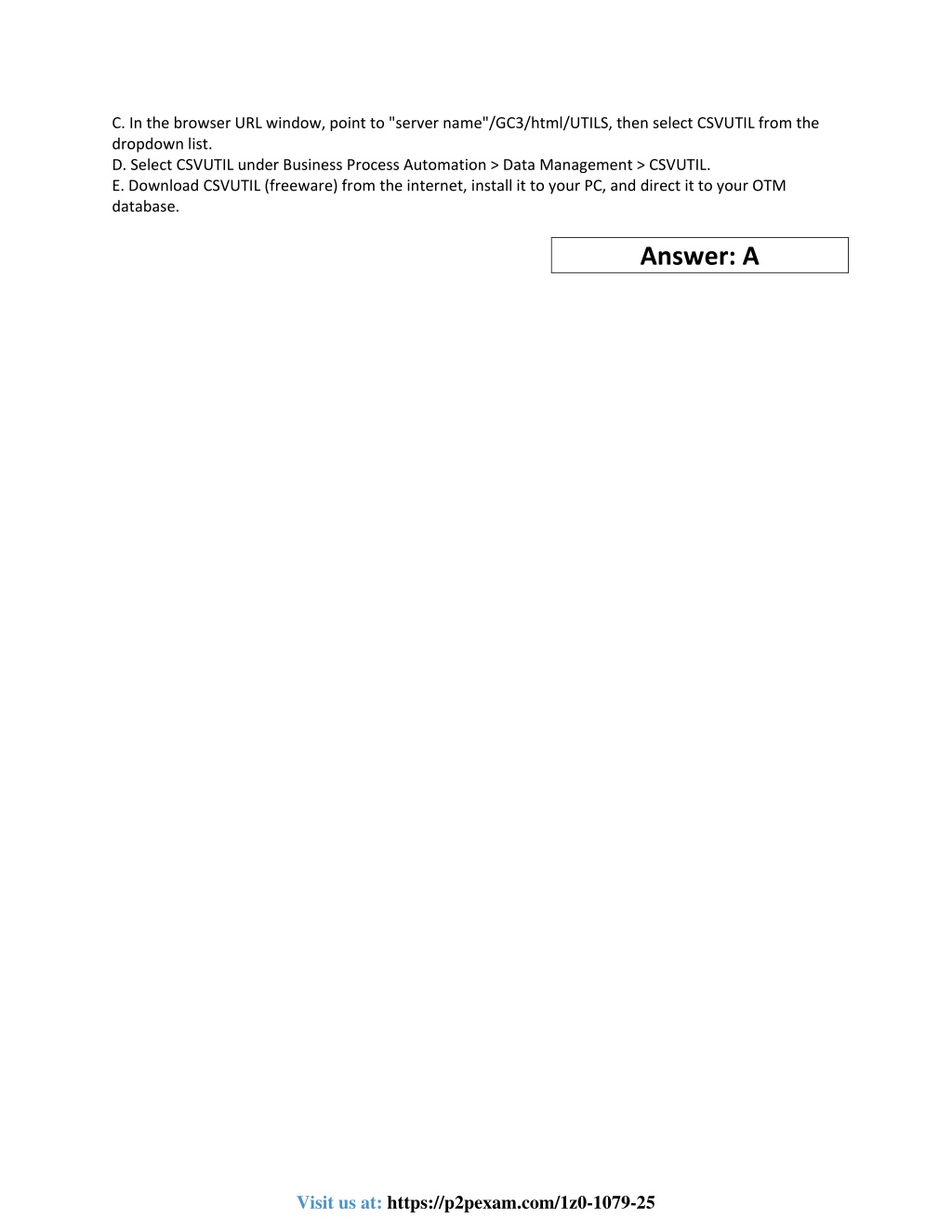 C.In the browser URL window, point to "server name"/GC3/html/UTILS, then select CSVUTIL from the dropdown list. D.Select CSVUTIL under Business Process Automation > Data Management > CSVUTIL. E.Download CSVUTIL (freeware) from the internet, install it to your PC, and direct it to your OTM database. Answer: A Visit us at: https://p2pexam.com/1z0-1079-25