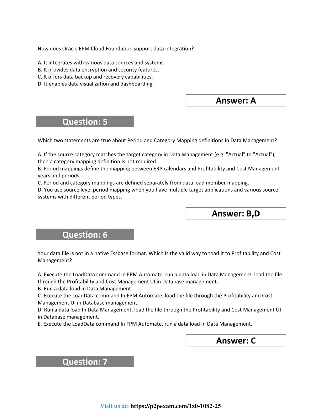 How does Oracle EPM Cloud Foundation support data integration? A.It integrates with various data sources and systems. B.It provides data encryption and security features. C.It offers data backup and recovery capabilities. D.It enables data visualization and dashboarding. Answer: A Question: 5 Which two statements are true about Period and Category Mapping definitions In Data Management? A.If the source category matches the target category in Data Management (e.g. "Actual" to "Actual"), then a category mapping definition Is not required. B.Period mappings define the mapping between ERP calendars and Profitability and Cost Management years and periods. C.Period and category mappings are defined separately from data load member mapping. D.You use source level period mapping when you have multiple target applications and various source systems with different period types. Answer: B,D Question: 6 Your data file is not In a native Essbase format. Which Is the valid way to toad It to Profitability and Cost Management? A.Execute the LoadData command In EPM Automate, run a data load in Data Management, load the file through the Profitability and Cost Management UI in Database management. B.Run a data load in Data Management. C.Execute the LoadData command In EPM Automate, load the file through the Profitability and Cost Management UI in Database management. D.Run a data load In Data Management, load the file through the Profitability and Cost Management UI in Database management. E.Execute the LoadData command In FPM Automate, run a data load In Data Management. Answer: C Question: 7 Visit us at: https://p2pexam.com/1z0-1082-25