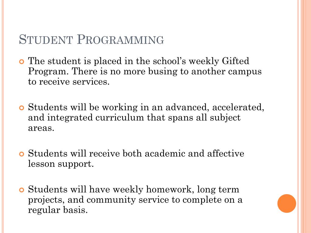 Student Programming • The student is placed in the school’s weekly Gifted Program. There is no more busing to another campus to receive services. • Students will be working in an advanced, accelerated, and integrated curriculum that spans all subject areas. • Students will receive both academic and affective lesson support. • Students will have weekly homework, long term projects, and community service to complete on a regular basis.