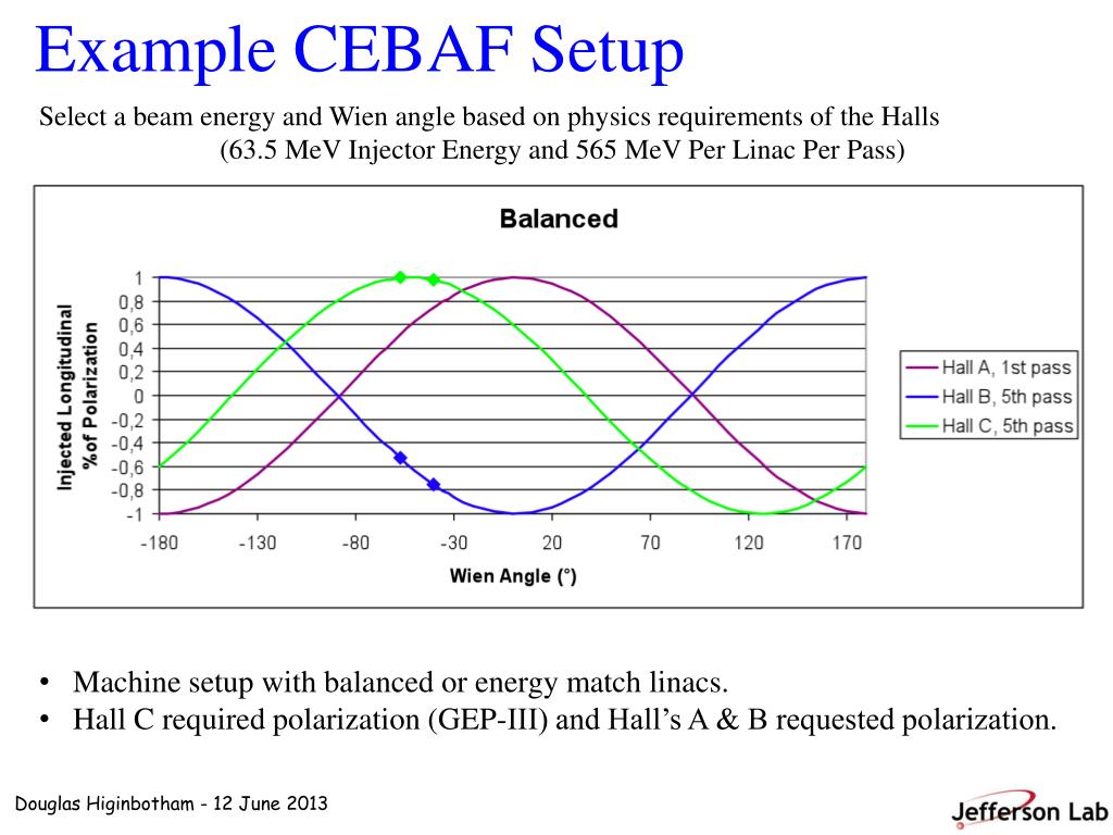 Example CEBAF Setup Select a beam energy and Wien angle based on physics requirements of the Halls (63.5 MeV Injector Energy and 565 MeV Per Linac Per Pass) • Machine setup with balanced or energy match linacs. • Hall C required polarization (GEP-III) and Hall’s A & B requested polarization.