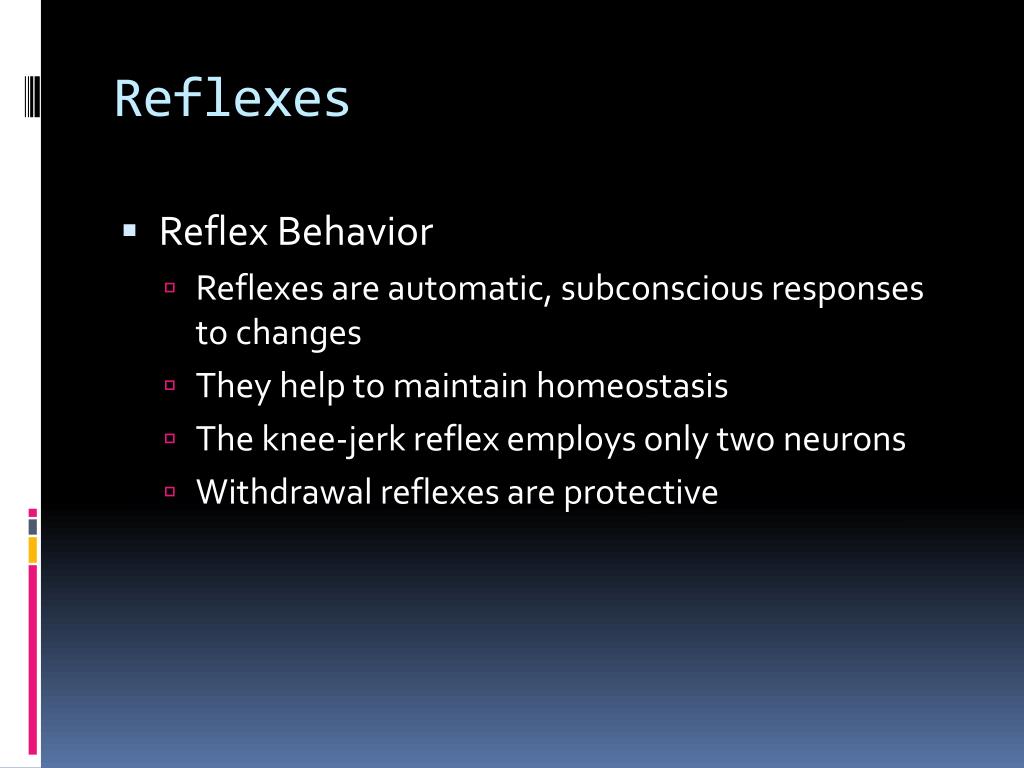 Reflexes • Reflex Behavior • Reflexes are automatic, subconscious responses to changes • They help to maintain homeostasis • The knee-jerk reflex employs only two neurons • Withdrawal reflexes are protective