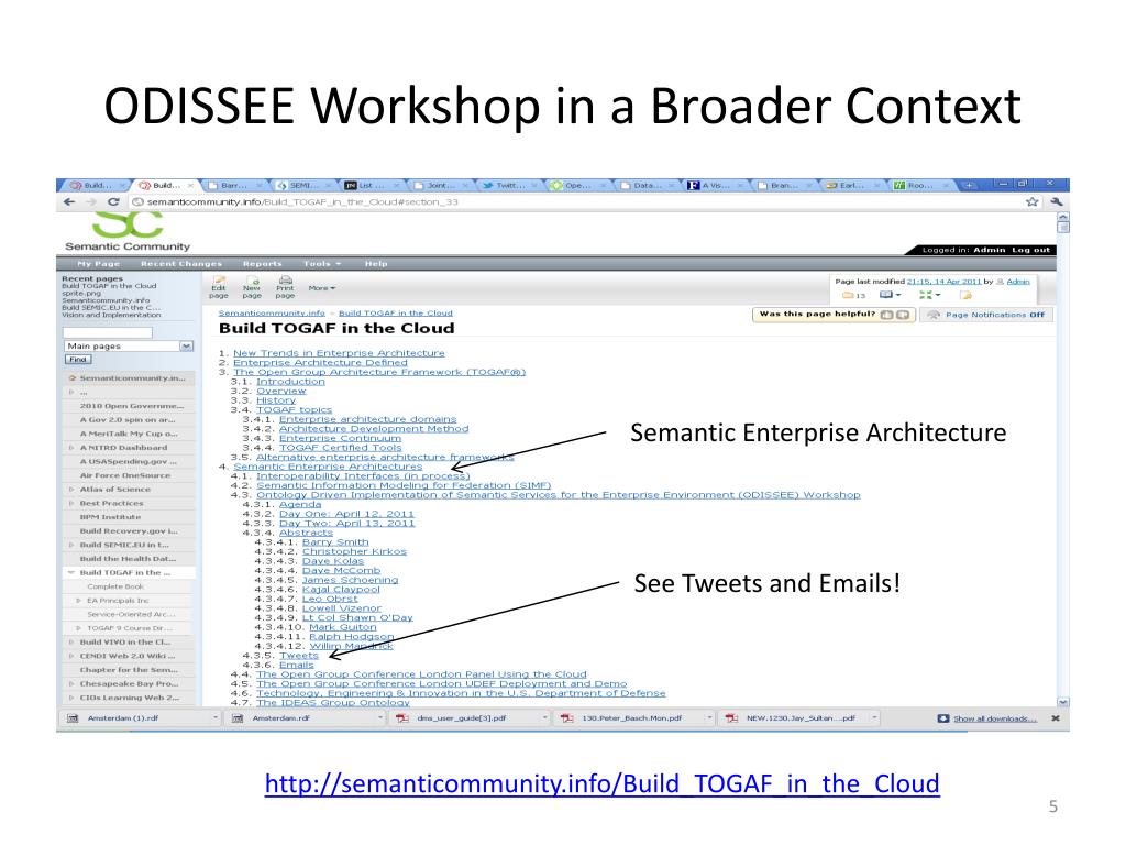 ODISSEE Workshop in a Broader Context Semantic Enterprise Architecture See Tweets and Emails! http://semanticommunity.info/Build_TOGAF_in_the_Cloud