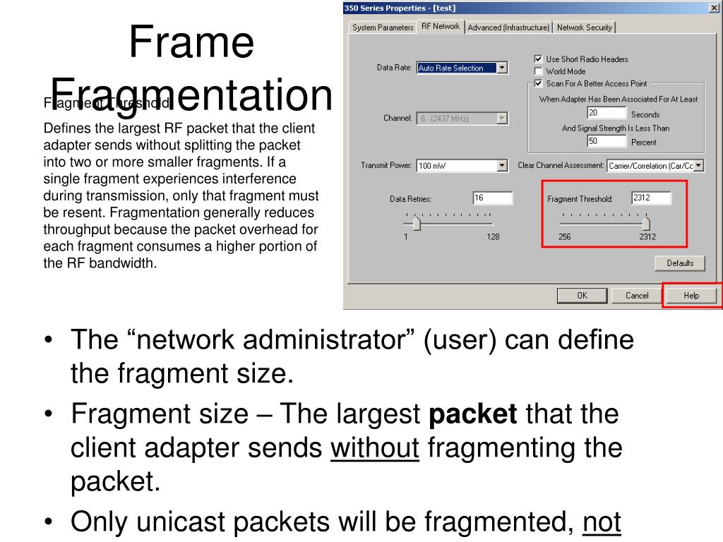 Frame Fragmentation Fragment Threshold: Defines the largest RF packet that the client adapter sends without splitting the packet into two or more smaller fragments. If a single fragment experiences interference during transmission, only that fragment must be resent. Fragmentation generally reduces throughput because the packet overhead for each fragment consumes a higher portion of the RF bandwidth. • The “network administrator” (user) can define the fragment size. • Fragment size – The largest packet that the client adapter sends without fragmenting the packet. • Only unicast packets will be fragmented, not broadcasts or multicasts.