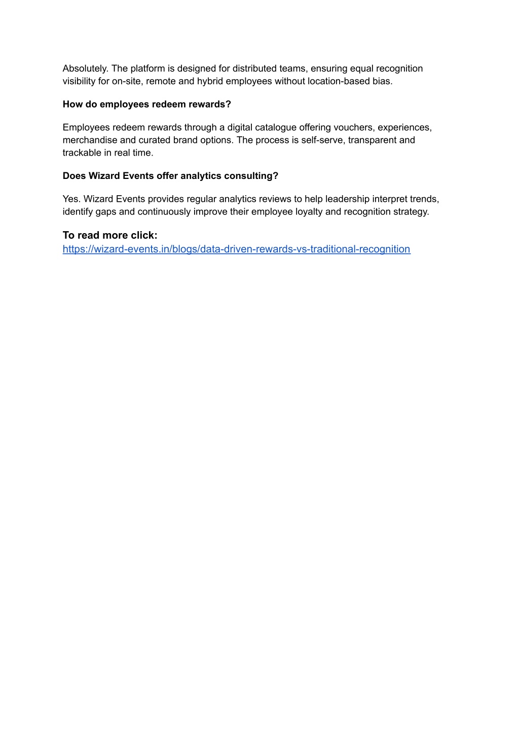 8. Absolutely. The platform is designed for distributed teams, ensuring equal recognition visibility for on-site, remote and hybrid employees without location-based bias. How do employees redeem rewards? Employees redeem rewards through a digital catalogue offering vouchers, experiences, merchandise and curated brand options. The process is self-serve, transparent and trackable in real time. Does Wizard Events offer analytics consulting? Yes. Wizard Events provides regular analytics reviews to help leadership interpret trends, identify gaps and continuously improve their employee loyalty and recognition strategy. To read more click: https://wizard-events.in/blogs/data-driven-rewards-vs-traditional-recognition
