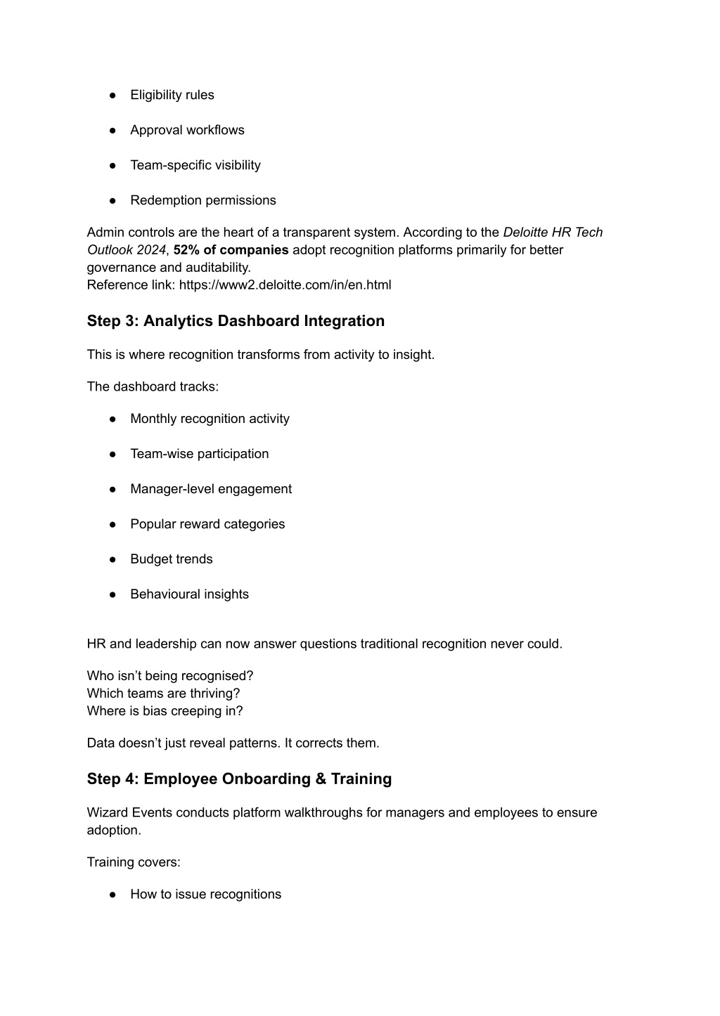 5. ● Eligibility rules ● Approval workflows ● Team-specific visibility ● Redemption permissions Admin controls are the heart of a transparent system. According to the Deloitte HR Tech Outlook 2024, 52% of companies adopt recognition platforms primarily for better governance and auditability. Reference link: https://www2.deloitte.com/in/en.html Step 3: Analytics Dashboard Integration This is where recognition transforms from activity to insight. The dashboard tracks: ● Monthly recognition activity ● Team-wise participation ● Manager-level engagement ● Popular reward categories ● Budget trends ● Behavioural insights HR and leadership can now answer questions traditional recognition never could. Who isn’t being recognised? Which teams are thriving? Where is bias creeping in? Data doesn’t just reveal patterns. It corrects them. Step 4: Employee Onboarding & Training Wizard Events conducts platform walkthroughs for managers and employees to ensure adoption. Training covers: ● How to issue recognitions