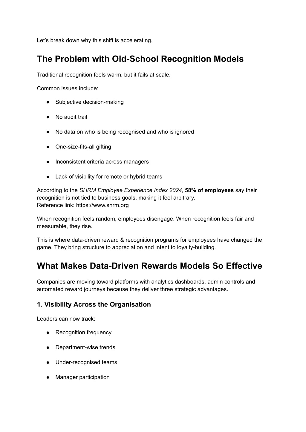 2. Let’s break down why this shift is accelerating. The Problem with Old-School Recognition Models Traditional recognition feels warm, but it fails at scale. Common issues include: ● Subjective decision-making ● No audit trail ● No data on who is being recognised and who is ignored ● One-size-fits-all gifting ● Inconsistent criteria across managers ● Lack of visibility for remote or hybrid teams According to the SHRM Employee Experience Index 2024, 58% of employees say their recognition is not tied to business goals, making it feel arbitrary. Reference link: https://www.shrm.org When recognition feels random, employees disengage. When recognition feels fair and measurable, they rise. This is where data-driven reward & recognition programs for employees have changed the game. They bring structure to appreciation and intent to loyalty-building. What Makes Data-Driven Rewards Models So Effective Companies are moving toward platforms with analytics dashboards, admin controls and automated reward journeys because they deliver three strategic advantages. 1. Visibility Across the Organisation Leaders can now track: ● Recognition frequency ● Department-wise trends ● Under-recognised teams ● Manager participation