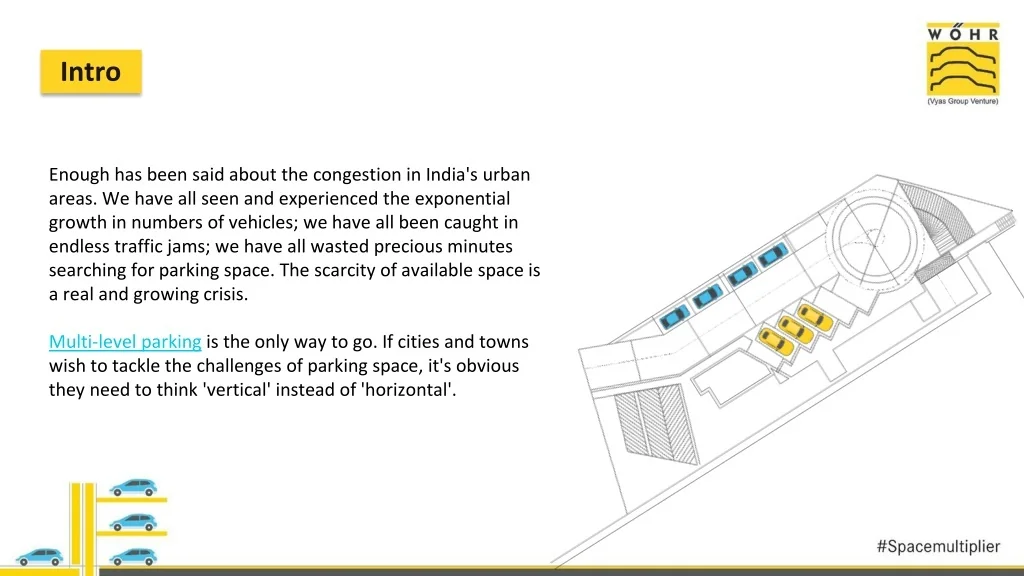 Intro Enough has been said about the congestion in India's urban areas. We have all seen and experienced the exponential growth in numbers of vehicles; we have all been caught in endless traffic jams; we have all wasted precious minutes searching for parking space. The scarcity of available space is a real and growing crisis. Multi-level parking is the only way to go. If cities and towns wish to tackle the challenges of parking space, it's obvious they need to think 'vertical' instead of 'horizontal'.